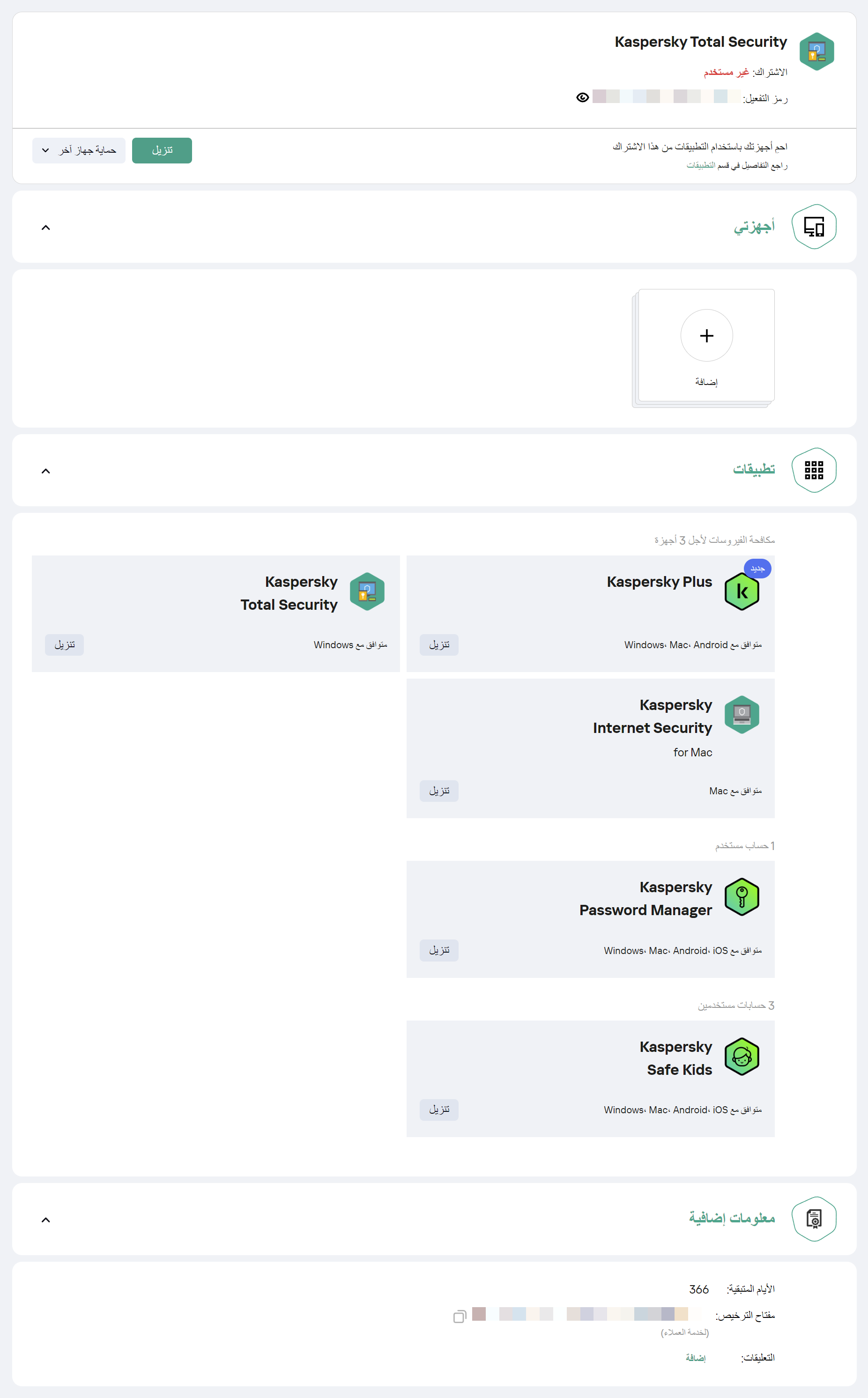 يمكن معرفة كامل تفاصيل الرخصة مثل الأنظمة و التطبيقات المدعومة و روابط تحميلها و عدد الأجهزة و الفترة و غيرها، من خلال ربطها بحسابك في My Kaspersky ثم ستتضح لك كامل معلومات الرخصة (صورة توضيحية).